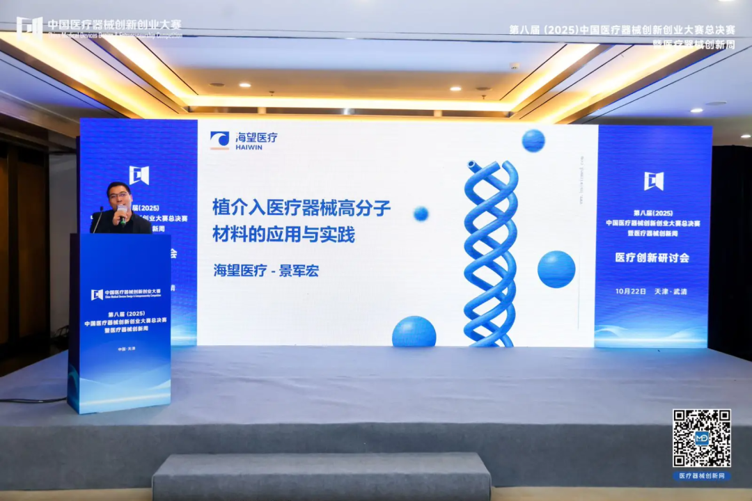 海望医疗技术(苏州)有限公司副总经理景军宏的演讲围绕医用高分子概述、医用高分子加工及改性技术、医用高分子材料实践三大模块展开。在医用高分子概述部分,他系统介绍了该类材料的发展历程、分类标准、核心特征、应用场景及全产业链布局;加工及改性技术环节,详解了适配植介入器械需求的材料医疗器械创新网与性能改性方案;实践应用环节则展示了具体的医用高分子材料与制品类型,并针对海望医疗在该领域可提供的专业服务进行了具体推介。