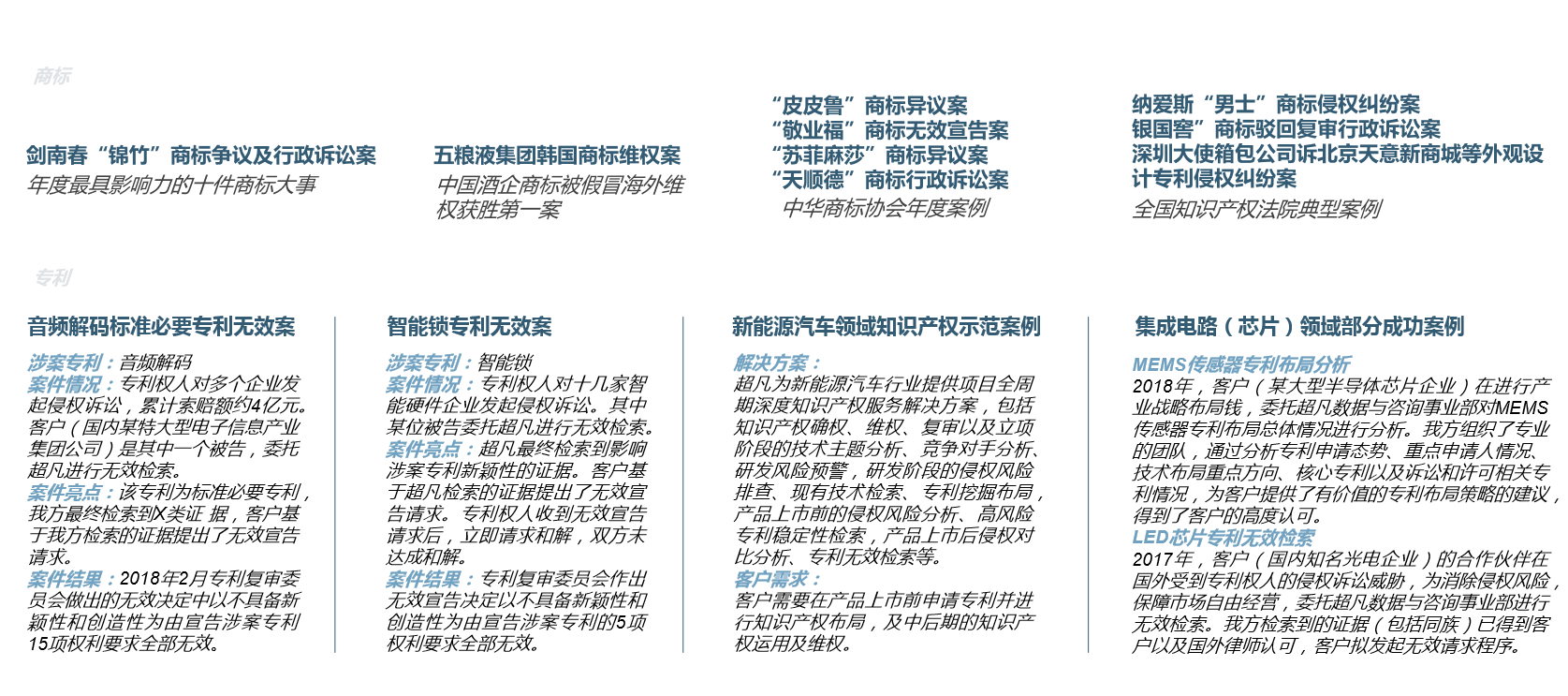 超凡拥有国内综合型知识产权专家团队,专利代理人/工程师、律师、咨询师、商标代理人等各类专家800余人,其中包括清华、北大、中科院博士在内的100余名多技术领域检索咨询专家团队,其成员大多具有10余年从业经验,全国专利信息人才6名;专利代理人/工程师440余人,而且50多人具有律师及专利代理人双重资格、海外留学背景或审查经验;超凡专家团队中,还包括亚洲知识产权专家、北京市十佳专利代理人等。 随着专业化建设的不断深入,超凡凭借深厚的实务经验及卓越的服务品质,铸就了多项典型案例,如成功代理的倍受社会各界关注、涉及37个异议主体、有史以来涉案主体数量最多的“国酒茅台”商标异议案,“拉杆箱”外观设计专利权纠纷、“男士”商标侵权纠纷等案件入选全国法院知识产权典型案例或专利复审委典型案例。同时,超凡不断强化学术建设,把理论研究作为“深化专业化”的有力支撑。在上海知识产权研究所发布的“2016年度知识产权专业文章发表排行榜”中,超凡发表专业文章数量在社会组织机构中排名第一。