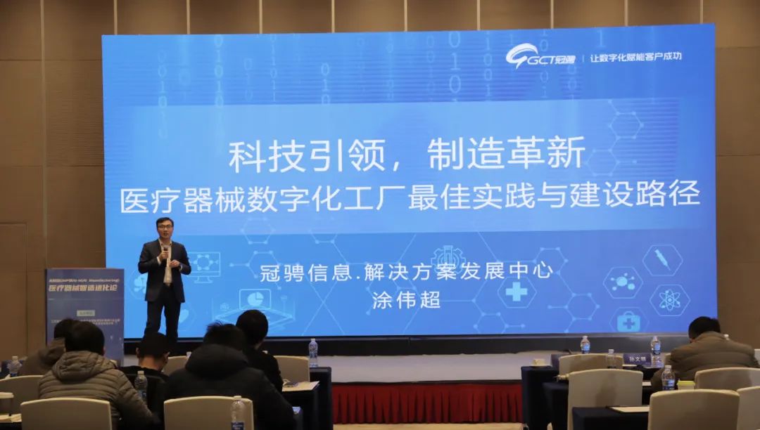 此外,冠骋信息分享了 《AI 引领变革:医疗器械智能制造创新分享》以及《科技引领,制造革新:医疗器械数字化工厂最佳实践与建设路径》主题报告。前者展示了冠骋信息在AI技术与医疗器械智能制造融合方面的最新成果。随着 AI 技术的飞速发展,AI 与数字化转型正加速融合,正全方位赋能医疗器械制造的各个环节。后者则深入剖析了医疗器械企业数字化工厂建设的核心路径,基于工信部智能制造能力成熟度模型的“流程化、数字化、网络化、智能化、产业链协同”五级进阶策略提出医疗器械行业的转型重点和方法,通过聚焦数字化精益制造、精益运营与合规保障三大目标来打造合规的医疗器械数字化工厂。